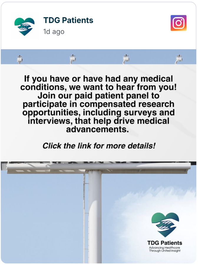 At TDG Health, you can participate in various research opportunities such as surveys, expert calls, and online bulletin boards. These activities are designed to collect valuable insights that help companies better understand patient experiences and identify unmet needs.